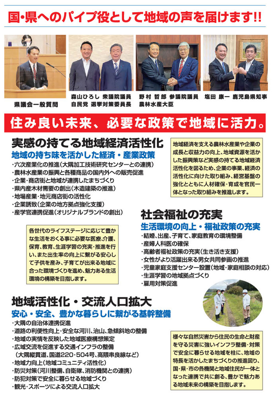 さて、昨今の日用品、燃料、光熱費、原材料の高騰によるしわ寄せは、日常生活において影響が強まる中、地域の課題や要望などを確実に把握し、「地域住民の声」を継続して県政に届ける事が必要不可欠です。